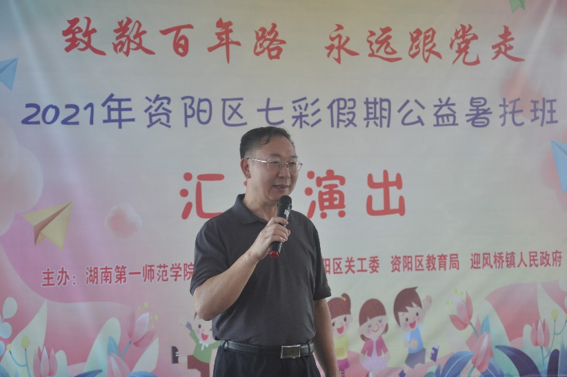 7月23日上午,由必赢官网“三下乡”社会实践团举办的“致敬百年路,永远跟党走”文艺汇演在长塘仑小学举行。莅临演出现场的领导和嘉宾有迎风桥镇党委书记谭莹,镇党委副书记、镇长肖博,团区委书记曾晴阳,迎风桥镇中心学校校长罗立强,长塘仑小学校长黄小毛,学院党总支书记王杰文,副书记成夏炎,党总支委员、副院长田祖伟,副院长何向阳,党总支委员、学工办主任关红儒,团总支书记、团队带队老师李荣敬。