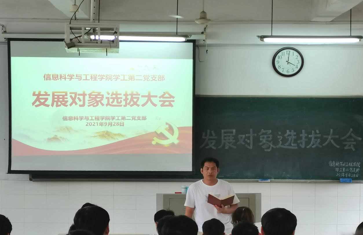 2021年9月28日,必赢官网学工第一、第二党支部通过线上与线下结合的方式召开本次发展对象选拔大会。与会人员有学工第二党支部书记李荣敬,全体学生党员和51名入党积极分子。大会分别由苏琴、张旭主持。