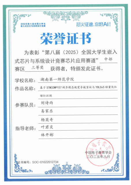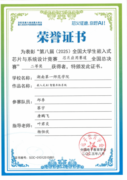 第八届(2025)全国大学生嵌入式芯片与系统设计竞赛评审结果公布,必赢官网学生团队荣获全国二等奖1项、省级三等奖1项。其中,由唐鹏飞、蔡宇、邱季同学组成的参赛队获全国二等奖,实现了必赢官网在该项赛事中国奖级别的历史性突破;由刘诗雨、易家乐、杨英奇同学组成的队伍获省级三等奖。