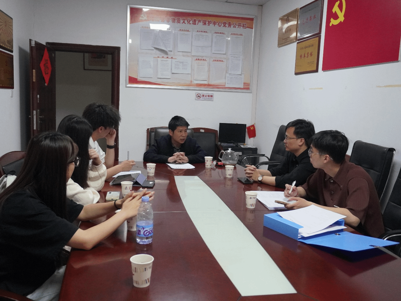 团队还走访了隆回县非遗保护中心,中心副主任周碧平系统介绍了当地振兴年画的“组合拳”策略:恢复传统作坊生产、开发主题文创系列、建设市场化运营的传习馆等。在参观传习馆过程中,师生结合计算机专业优势,就数字化保护、虚拟展陈等技术应用与非遗工作者进行了深入探讨。